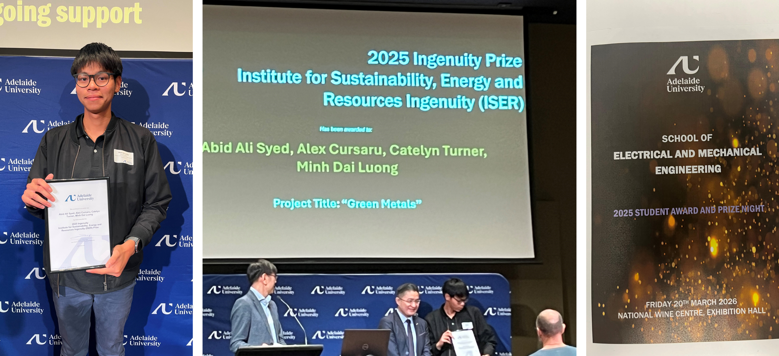 Congratulations to Kenny (Minh Dai) Luong who was recently presented with the ‘Institute for Sustainability, Energy and Resources Ingenuity (ISER) Prize at the Adelaide University School of Electrical and Mechanical Engineering Student Award and Prize Night (for 2025) on Friday 20th March 2026 at the National Wine Centre, Exhibition Hall with 3 other students for their Project on Australian Green Steel.